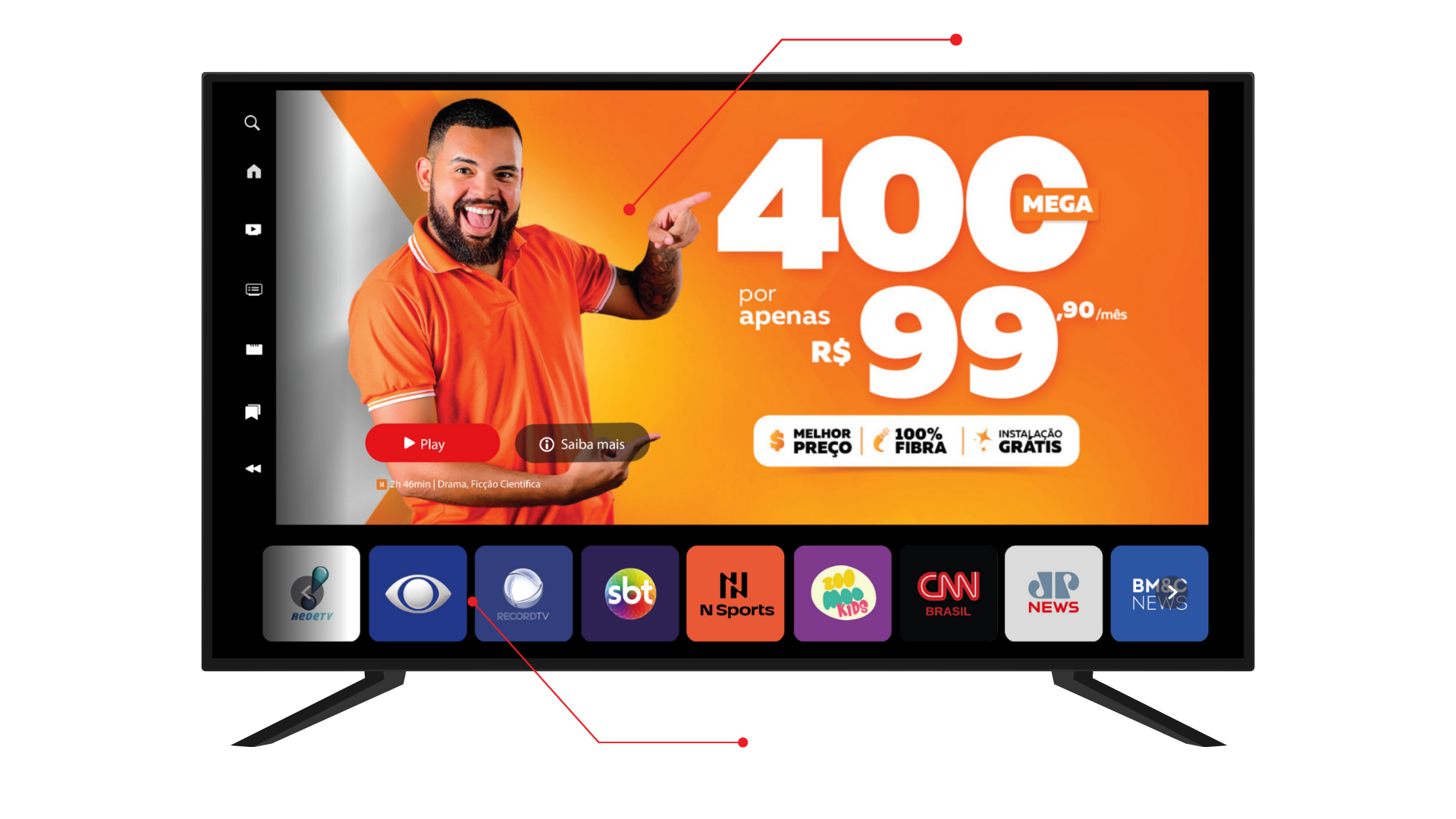 Você oferece TV e streaming aos seus clientes com licenças SEAC e SVA 100% regularizadas. A plataforma roda em qualquer dispositivo e você personaliza com sua marca.