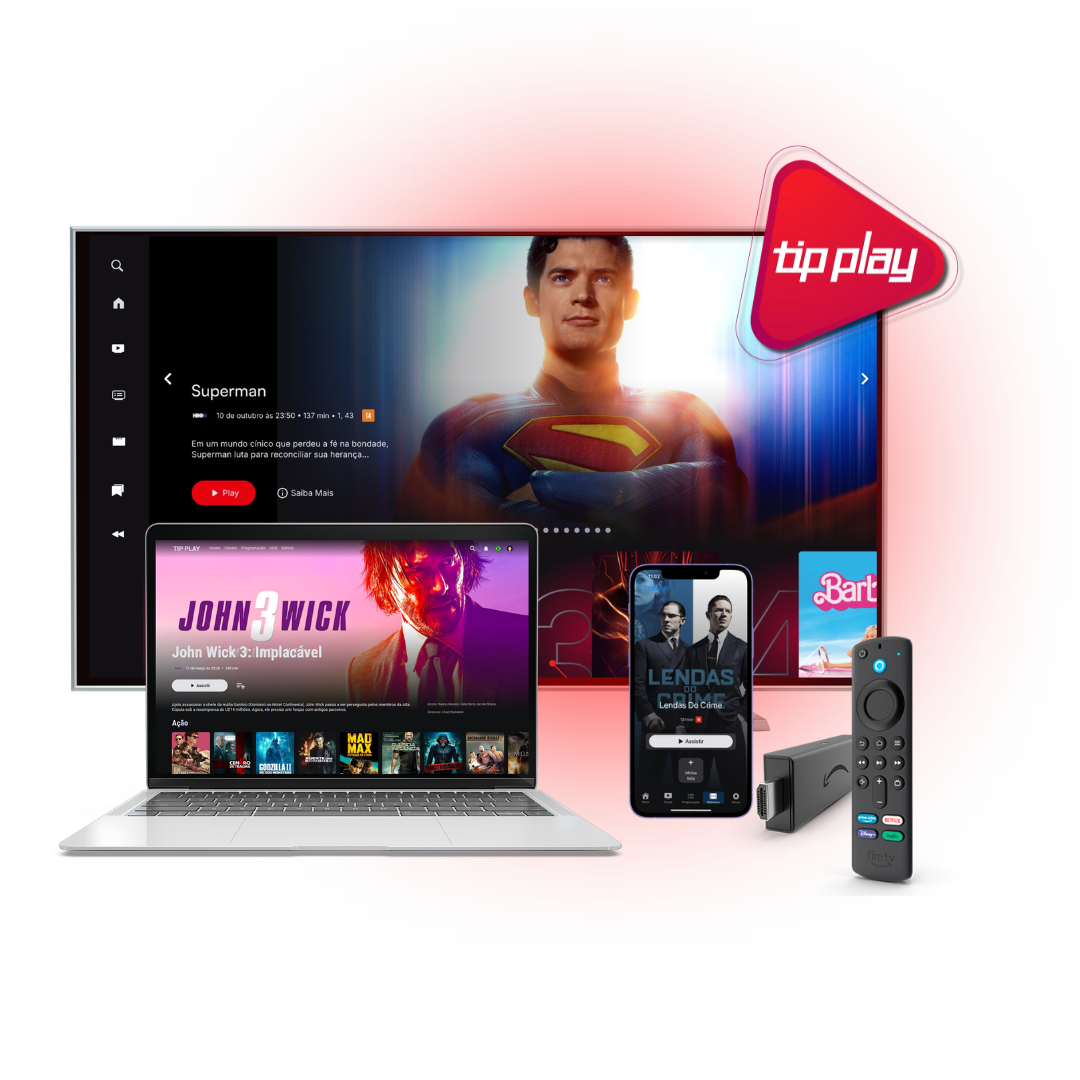 Smart TVs, celulares, tablets, computadores e TV Box. Seus clientes assistem de qualquer lugar, em múltiplas telas simultâneas.